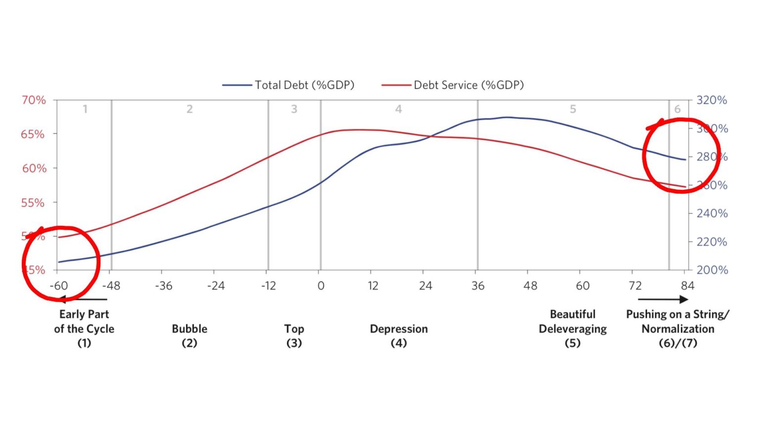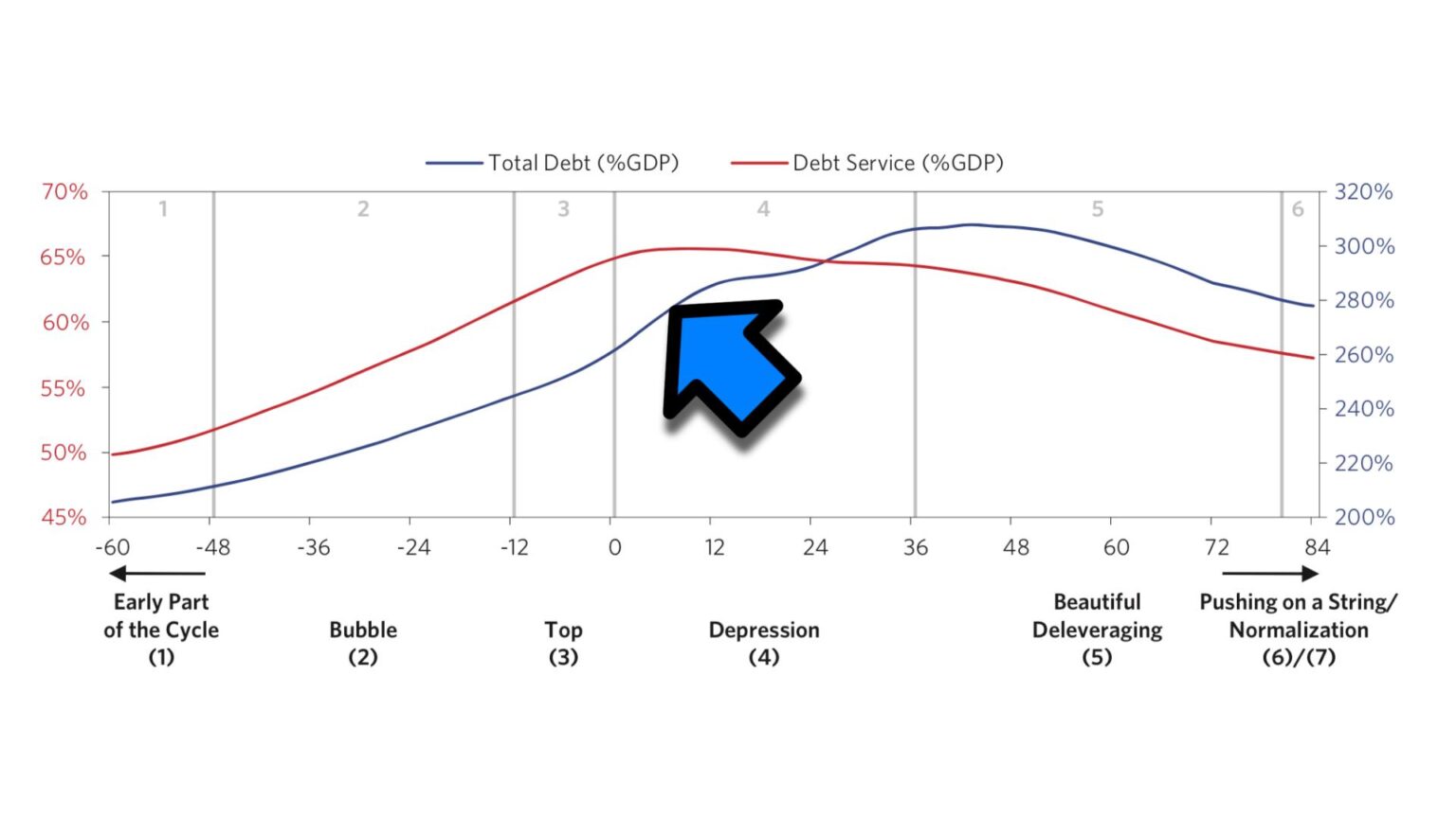 Above is a typical short-term debt cycle as described in Ray Dalio’s “Big Debt Crises.” The cycle spans about 12 years, from recovery through a bubble phase to a decline and debt deleveraging. The key metric is total debt as a percentage of GDP.