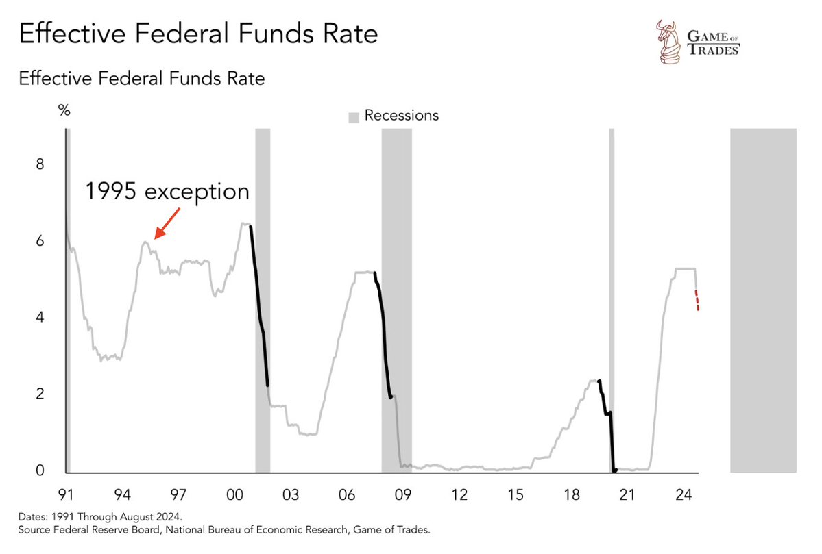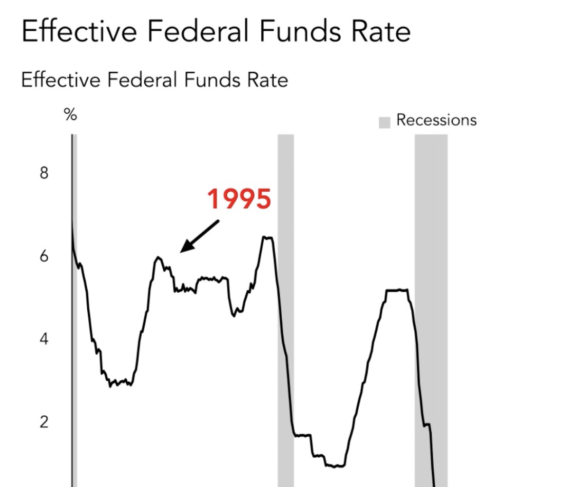 The last time the Fed managed to engineer a “soft landing”—a slowdown without triggering a recession—was in 1995. Back then, after a series of rate hikes, the Federal Reserve deftly steered the economy away from a downturn, resulting in an economic boom that lasted until 2000. This period remains one of the few success stories in the Fed’s history of avoiding recessions following rate increases.