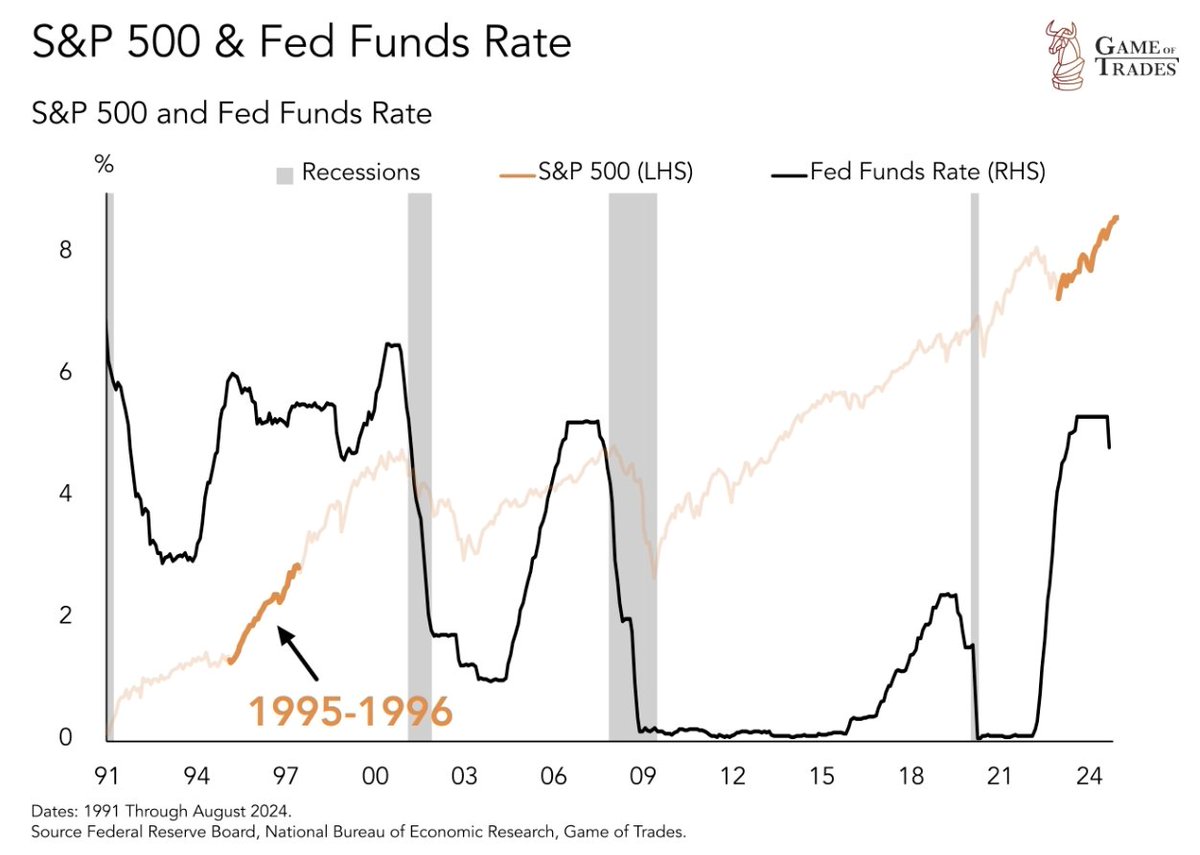 Interestingly, the S&P 500’s performance today mirrors that of 1995. The stock market appears optimistic, with returns showing similar patterns to the mid-90s, signaling that investors believe another soft landing is possible. Could this be a sign that the Fed will succeed again, or is the market too optimistic?